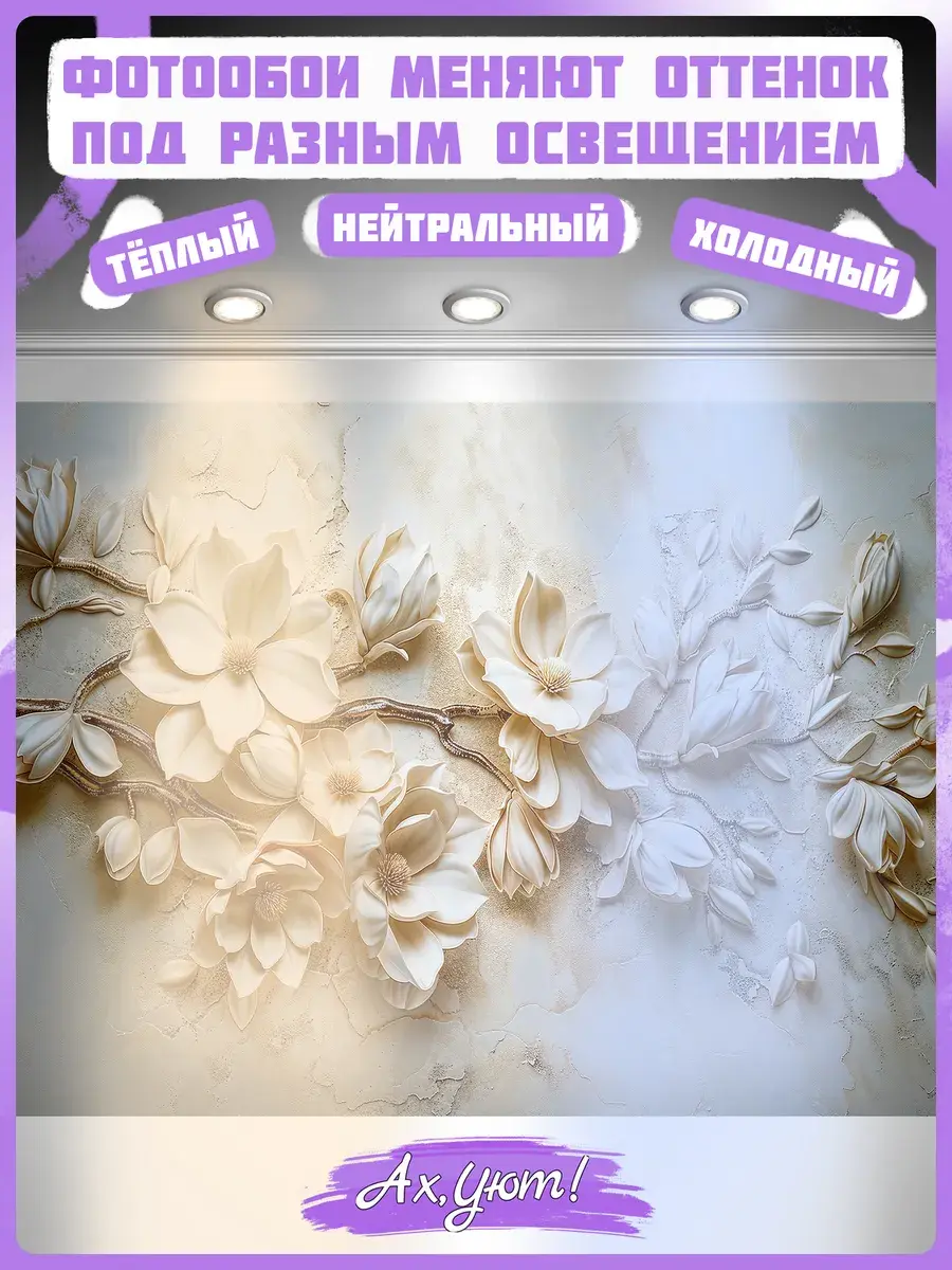 Добавьте в интерьер нотки природной красоты и изысканности с виниловыми фотообоями, выполненными с потрясающим 3D-эффектом. Эти моющиеся обои горячего тиснения на флизелиновой основе станут стильным украшением для любого помещения, будь то зал, гостиная, спальня или прихожая. Модные и актуальные в 2025 году, они подчеркнут ваш вкус и добавят пространству атмосферу уюта и гармонии. Центром композиции является объёмное изображение цветов на ветке. Цветы крупные, с множеством лепестков, выполнены в светлых кремовых и бежевых,золотистых, светлоперсиковых тонах. Ветка изогнутая, с текстурой, напоминающей дерево. А светлый фон с текстурой штукатурки, создает эффект глубины. Общий вид напоминает барельеф или скульптурное изображение, создавая уютную и спокойную атмосферу. Эти фотообои идеально подойдут для тех, кто ценит природную красоту и современный дизайн. Они добавят пространству визуального объёма и стиля, превратив стену в настоящий акцентный элемент. Благодаря технологии горячего тиснения и флизелиновой основе, фотообои устойчивы к повреждениям и легко наносятся на стену. Моющаяся поверхность позволяет поддерживать их в идеальной чистоте, сохраняя яркость и свежесть красок на долгие годы. Выбирайте эти красивые и современные фотообои, чтобы добавить в интерьер нотки природной гармонии, уюта и стиля.