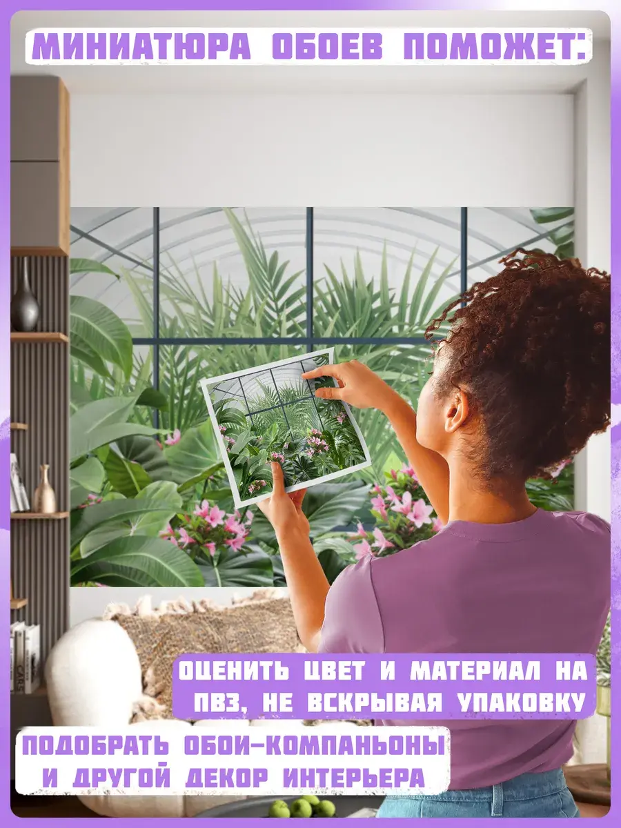 Добавьте в интерьер нотки природной красоты и свежести с виниловыми фотообоями, выполненными с потрясающим 3D-эффектом. Эти моющиеся обои горячего тиснения на флизелиновой основе станут стильным украшением для любого помещения, будь то зал, гостиная, спальня, кухня или прихожая. Модные и актуальные в 2025 году, они подчеркнут ваш вкус и добавят пространству атмосферу уюта и гармонии. На переднем плане через окно виден сад, с большим количеством зелёных растений. Среди них выделяются крупные зеленые листья пальм. Также присутствуют розовые цветы, которые добавляют яркости композиции, а через прозрачную крышу проникает свет, освещая растения и создавая эффект глубины и реалистичности. Благодаря технологии горячего тиснения и флизелиновой основе, фотообои устойчивы к повреждениям и легко наносятся на стену. Моющаяся поверхность позволяет поддерживать их в идеальной чистоте, сохраняя яркость и свежесть красок на долгие годы. Выбирайте эти красивые и современные фотообои, чтобы добавить в интерьер нотки природной гармонии, уюта и стиля, превратив стену в настоящий акцентный элемент, а маленькие размеры фотообоев помогут быстро преобразить интерьер и сэкономить семейный бюджет!